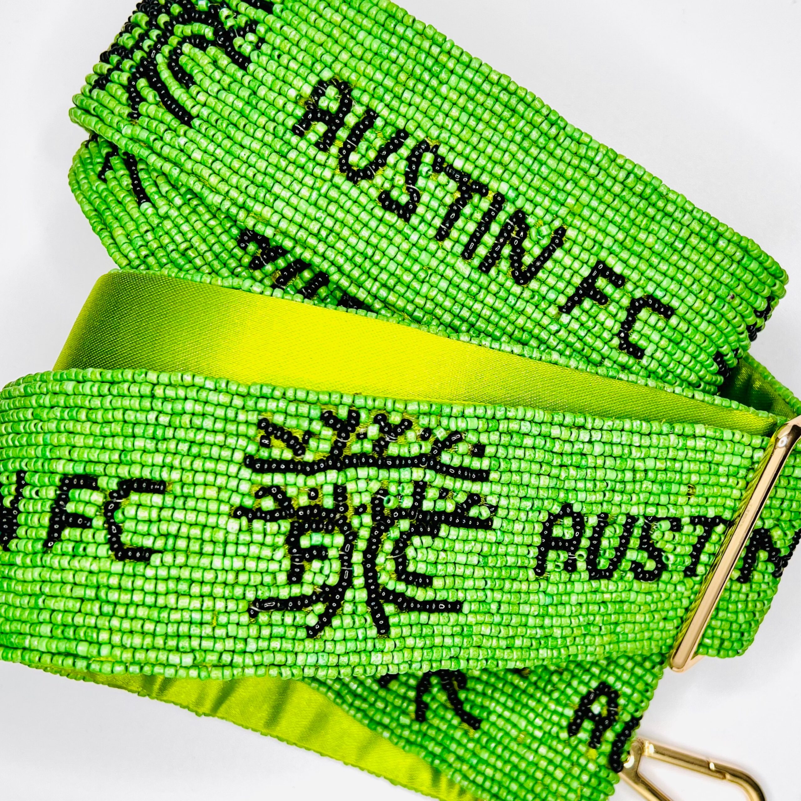 Adjustable strap is 52″ long and 2″ wide with glass beads, satin backing and metal (gold) hardware.