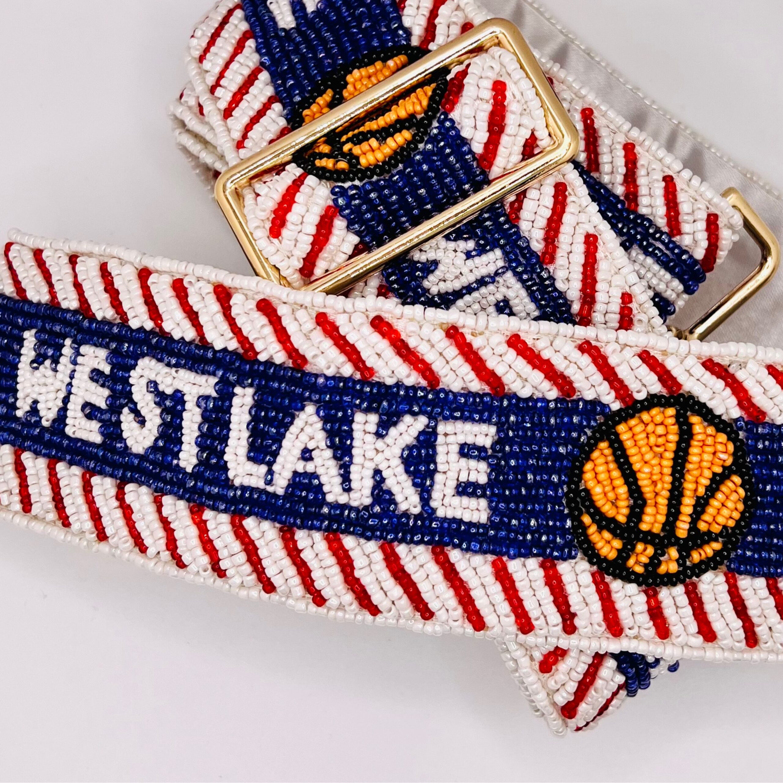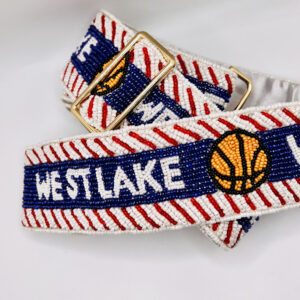 Adjustable strap is 52″ long and 2″ wide with glass beads, satin backing and metal (gold) hardware.